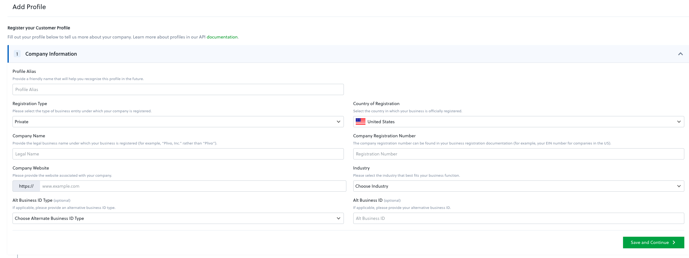 Profiles help VTS understand your business and the types of messages you’ll be sending. Complete the profile section with your company information, details like your website URL and industry, and your EIN or Tax ID number. We also need a physical address and a dedicated contact. Once you’ve completed and submitted your profile, you’ll move on to the brand registration page.