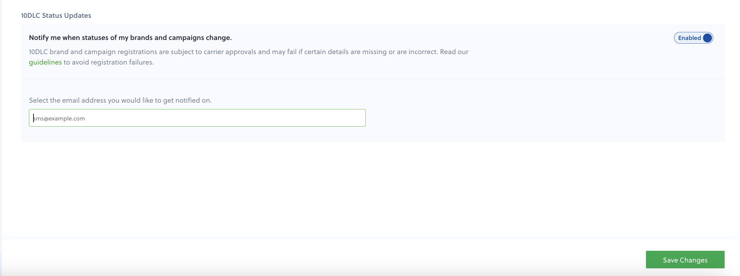 Users can now set up email alerts for up to 10 recipients in VTS’s console. Receive an email each time a brand is registered, fails verification, or when a campaign is approved or rejected by carriers.
