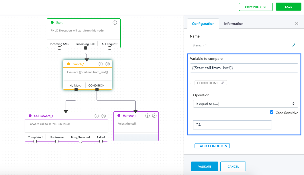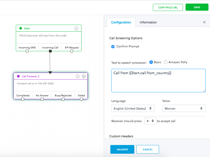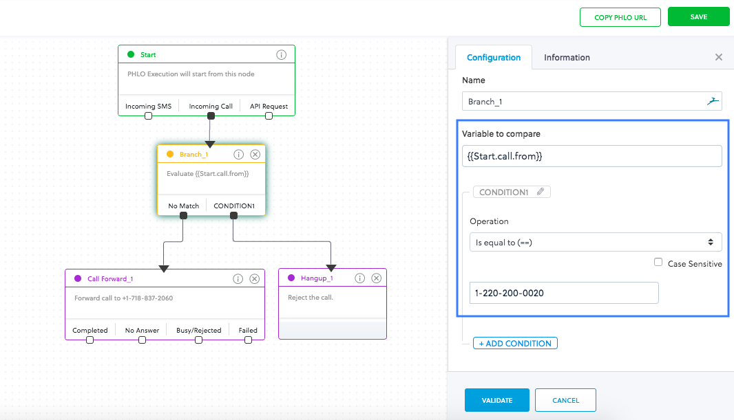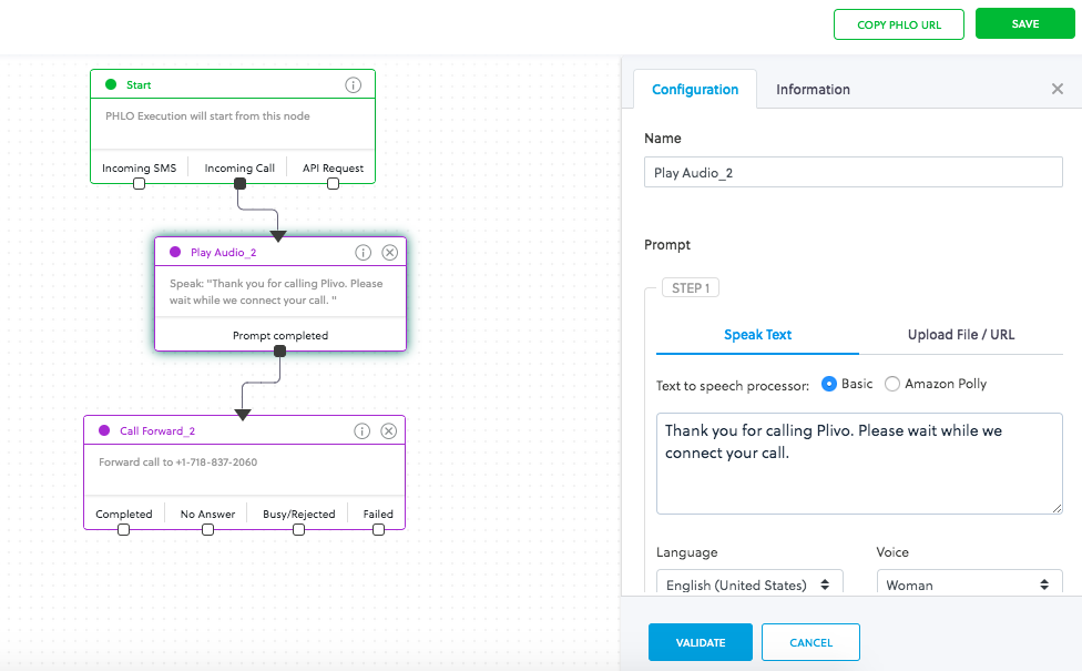 Since your call forwarding application is powered by PHLO, you can edit your application and add features from the PHLO canvas. Changes you make to an existing PHLO take effect as soon as you save the application.