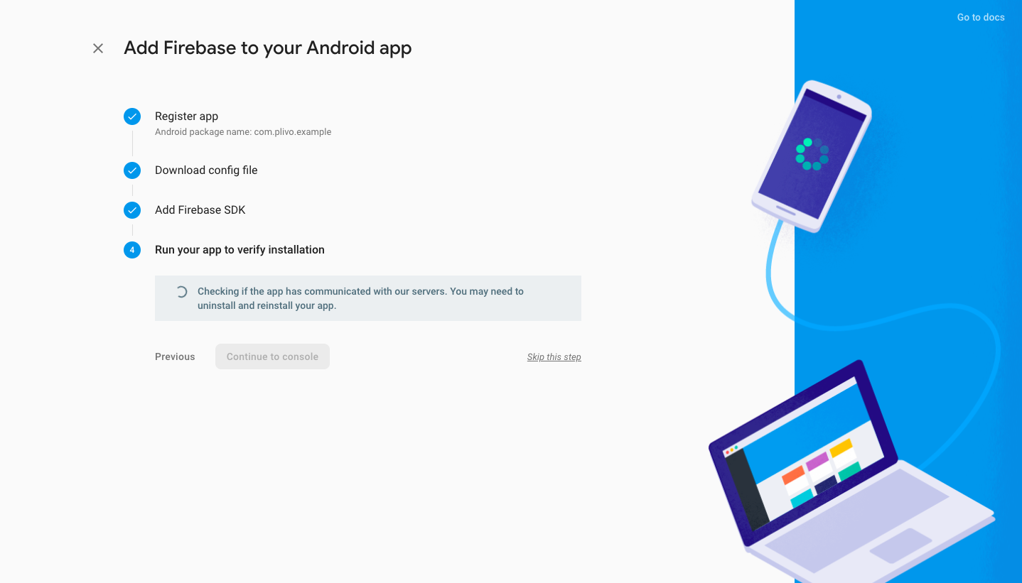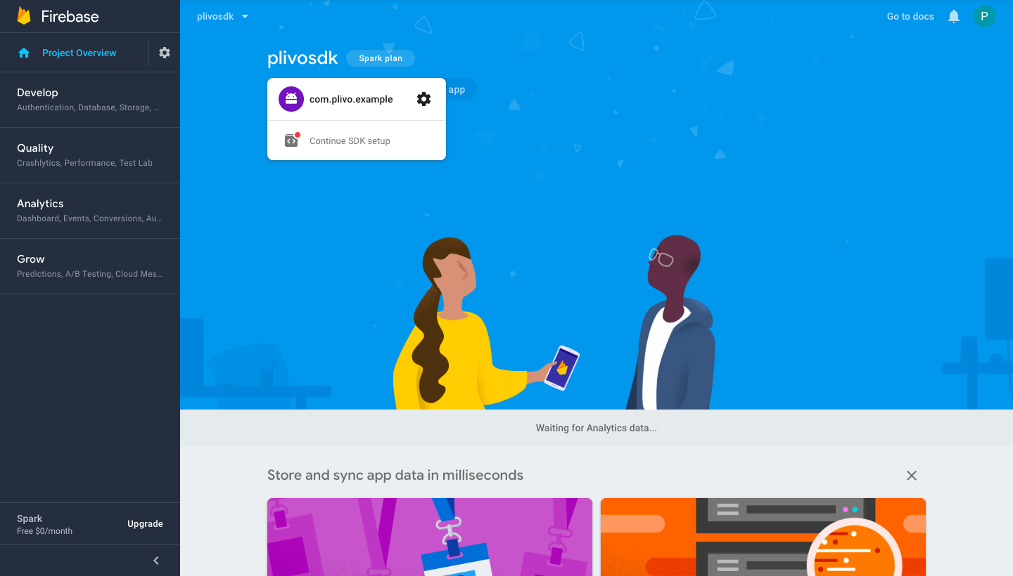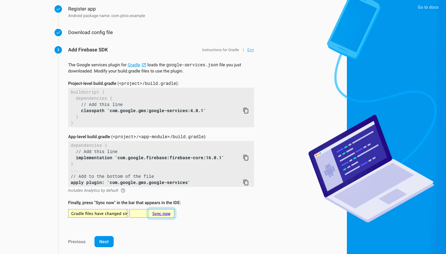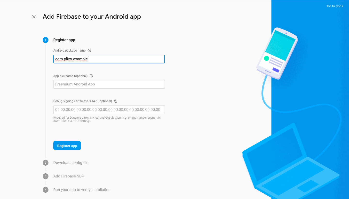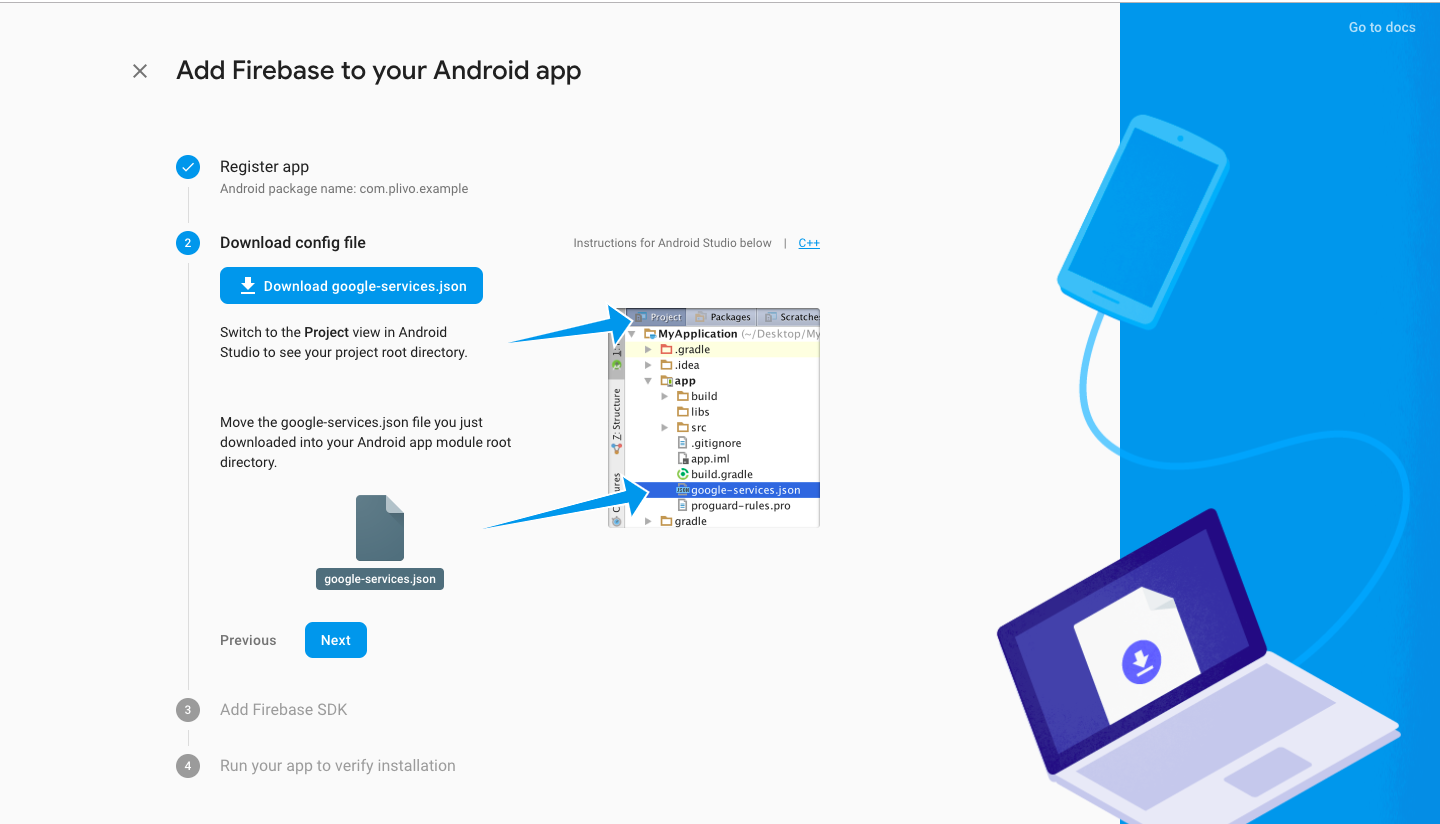 Go to the Android section of your project home page and register your Android package on Firebase.