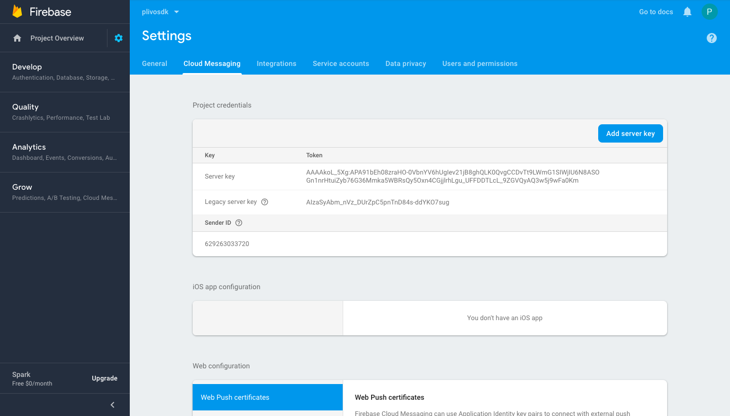 From the project settings, under the Cloud Messaging tab, copy the server key token.
