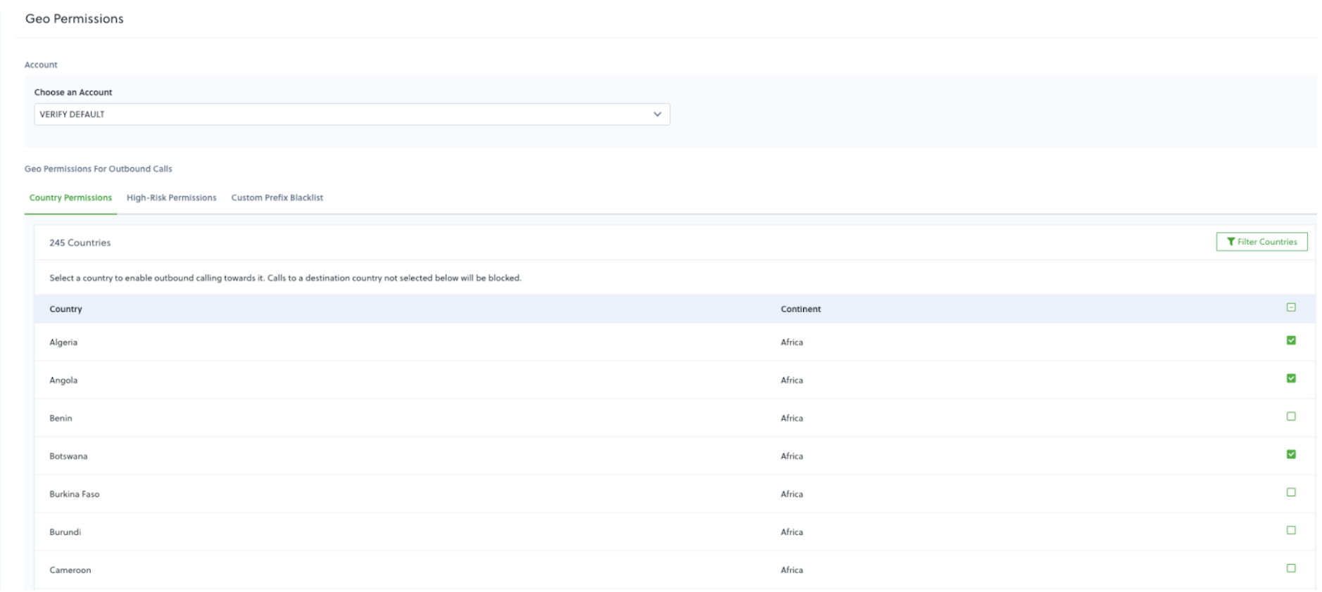 Here you’ll see a list of all countries. You can filter the list by selecting specific geographic regions or countries. Geo permission configurations are applied immediately to all calls initiated via Plivo APIs.