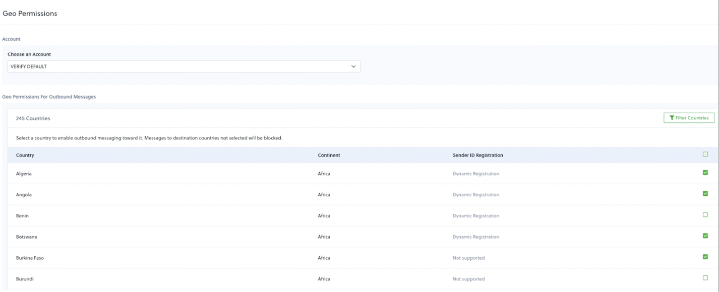 To manage your SMS geo permissions, navigate to Messaging > Geo Permissions on the console. Select the subaccount to which you’ve mapped your application, then select a country to enable outbound messaging toward it. Messages to destination countries not selected will be blocked. You can filter the country list by selecting specific geographic regions or countries.